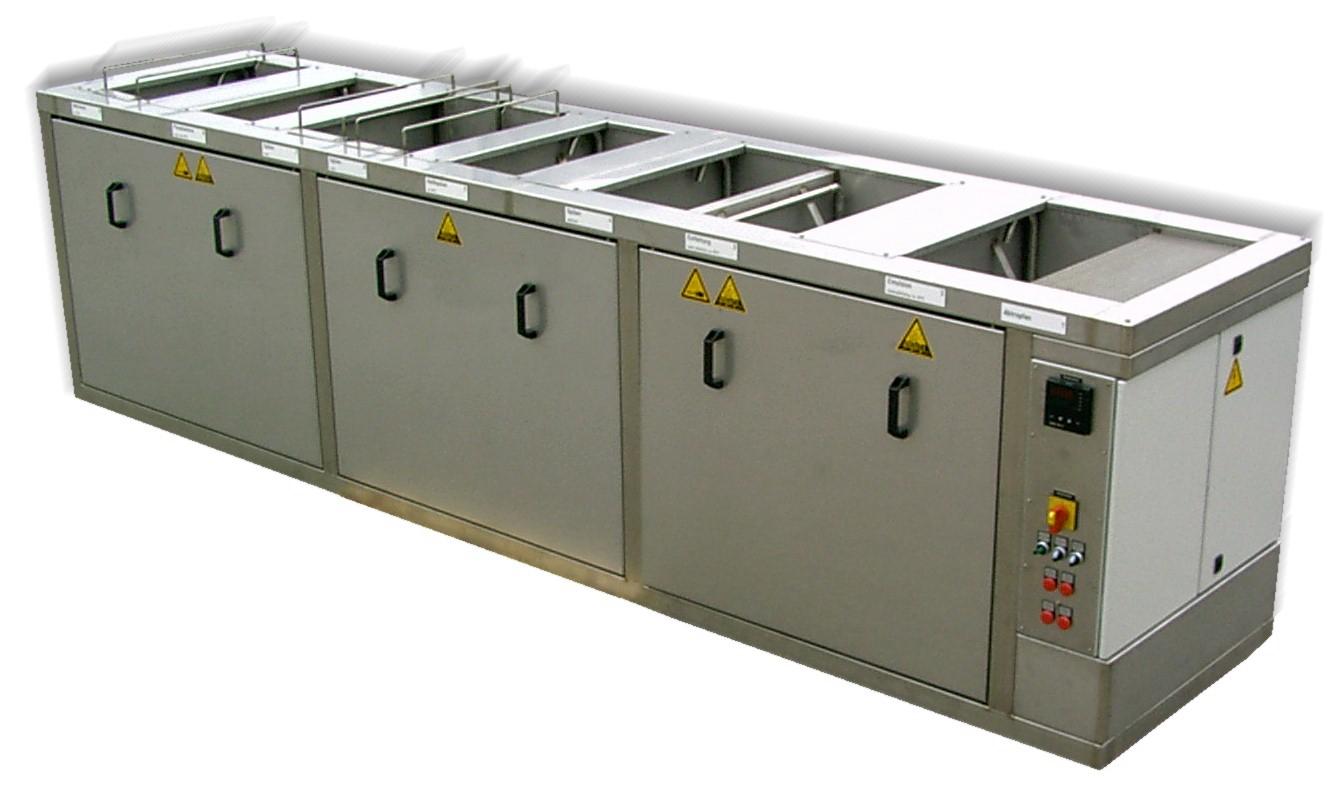 • S výjimkou černící lázně je provedení všech lázní, celého plechového obložení a nosných profilů zařízení z ušlechtilé oceli (č. materiálu 1.4301). Tím je zaručena dlouhá životnost, dobré možnosti čištění a v neposlední řadě i dobrý optický celkový dojem zařízení.